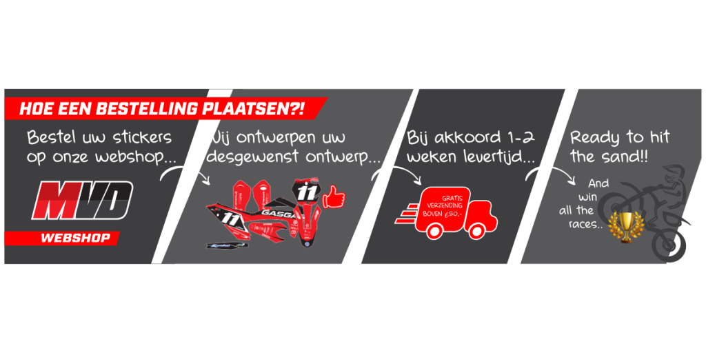 Bij MVDecals ontwerpen en produceren we hoogwaardige MX decals die perfect passen op jouw motor. Onze stickers zijn kras- en weerbestendig, waardoor ze zelfs onder de zwaarste omstandigheden mooi blijven.